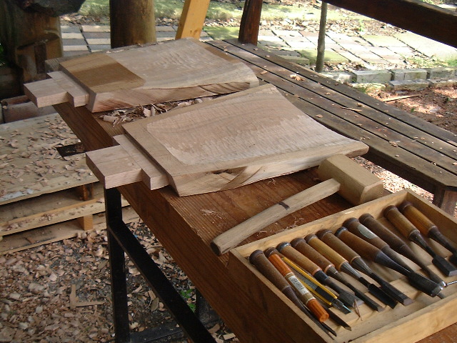 | 背もたれ部分の加工です。少し湾曲させて後ろに反っていく(難しいなぁ〜)感じに仕上げたい。一つならいいけど、同じモノを2つというのは苦しい。材料の都合もあって夫婦茶碗のように一つはチョット小振りにしてアクセントを付けることに。。その方が楽しいし・・・^^;; |
